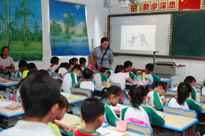 6月21日上午,定安县龙河镇中心学校5年级的同学迎来了一堂别开生面的“新活力”英语课。讲台上,来自海口市琼山区攀丹小学的邓惠丹老师以“快乐轻松”的形式,带着学生们探索英语世界。课堂上,孩子们听得津津有味,踊跃举手回答问题。“第一次通过这种形式上英语课,才发现英语这么有趣,富有挑战性。” 孩子们兴奋地说。这是我校针对扶贫点开展的送课下乡活动,我校组织的省内外骨干教师来到定安县龙河镇中心学校,为全县的小学教师们送上公开示范课。