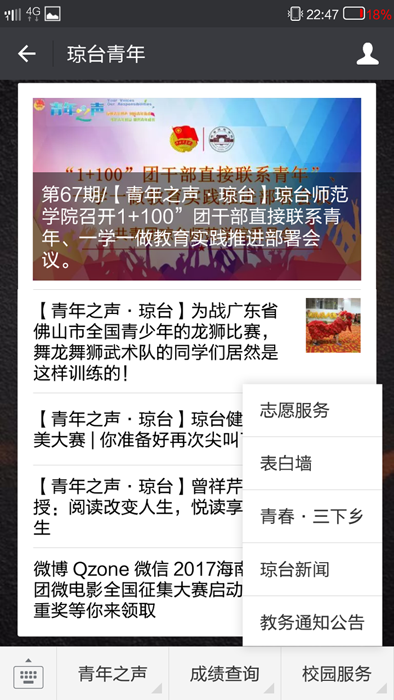 琼台师范学院共青团官方微信公众平台至开通以来,发布稿件600余期,图文阅读次数近200万次,现在拥有关注人数1.4万余人。琼台师范学院共青团官方微信公众平台,充分利用微信这一网络多媒体平台为宣传载体,用新颖的题材、亲民的语言等团员青年喜闻乐见的宣传形式,不断开拓和创新团学宣传、引领工作,建设起具有鲜明特色的琼台师范学院团委官方微信。开展各项主题教育实践活动,激励了广大团员青年坚定理想、勤奋学习,引导青年学生“践行核心价值观、携手共驻中国梦”,收到了良好的宣传效果,同时,通过团队的配合、努力,实现代码开发模式,丰富了宣传手段、提高了服务质量,受到学校各相关部门的好评,琼台师范学院“琼台青年”形象已深入人心,得到了广大师生的支持和信赖。