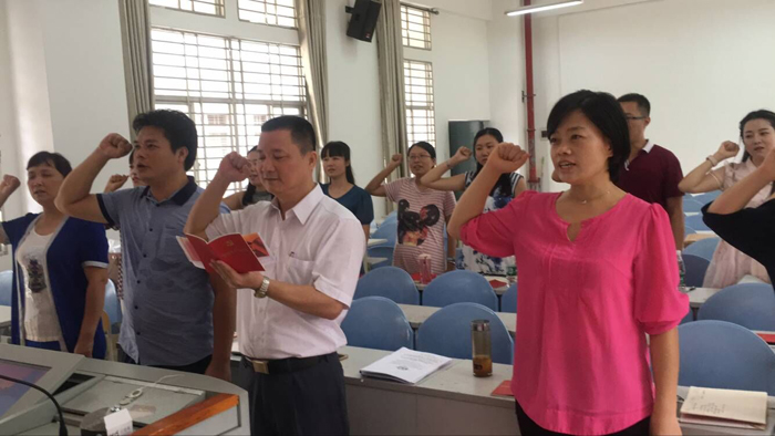 7月3日上午,党日活动在雄壮的国歌中隆重开始,“我志愿加入中国共产党……”系党总支书记曾德锦带领外语系全体党员站在鲜红的党旗面前,高举右手,庄严宣誓。紧接着,曾书记给在座党员上了一堂“一心向党,砥砺前行,做合格教师党员”的主题党课,曾书记围绕外语系教师的具体工作,要求全体党员在今后的学习工作和生活中,要旗帜鲜明讲政治,对党保持绝对忠诚;要加强和规范党内政治生活,切实树立大局意识;要有极端负责的态度,敢于直面问题;要有奉献精神,切实做到廉洁自律。
