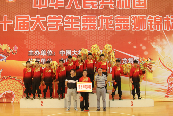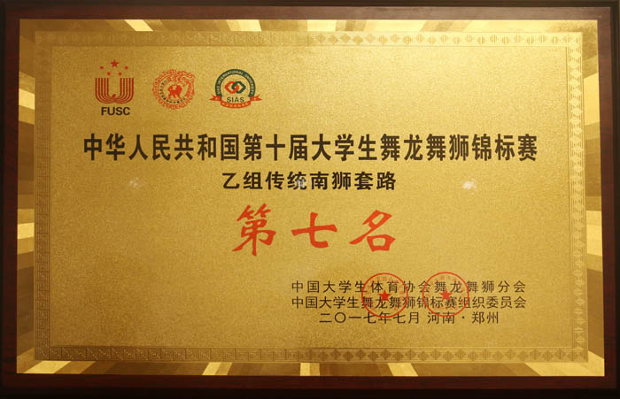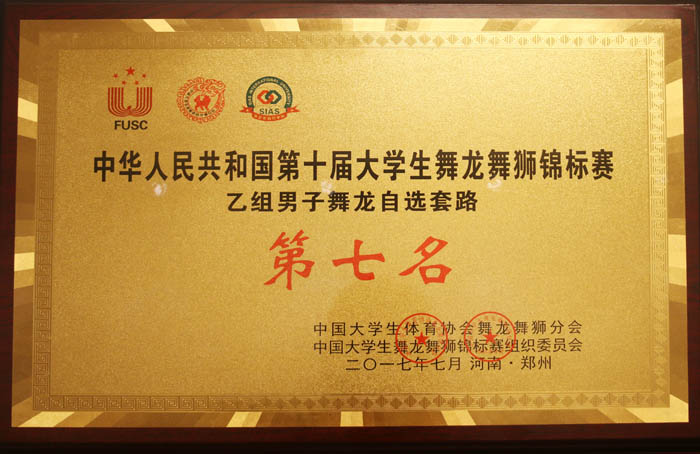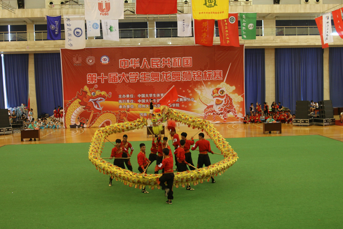 7月10日至15日,第十届全国大学生舞龙舞狮锦标赛在郑州大学西亚斯国际学院举行,我校龙狮代表队在校团委书记柳善文和教练员岳岩、刘坤翔的带领下,共派出21名运动员参加了乙组(体育院校)男子传统南狮套路与舞龙自选套路2个项目的比赛,全体学生经过团结协作、努力拼搏,最终获得传统南狮套路、舞龙自选套路两个第七名,首次参加这项高规格的赛事即取得历史性的突破,成绩斐然。