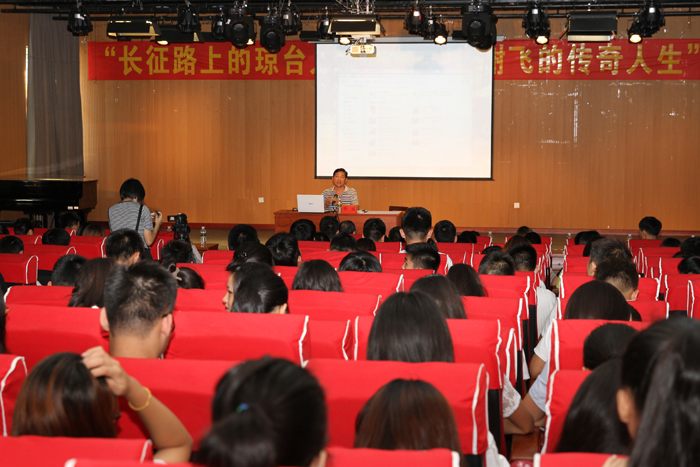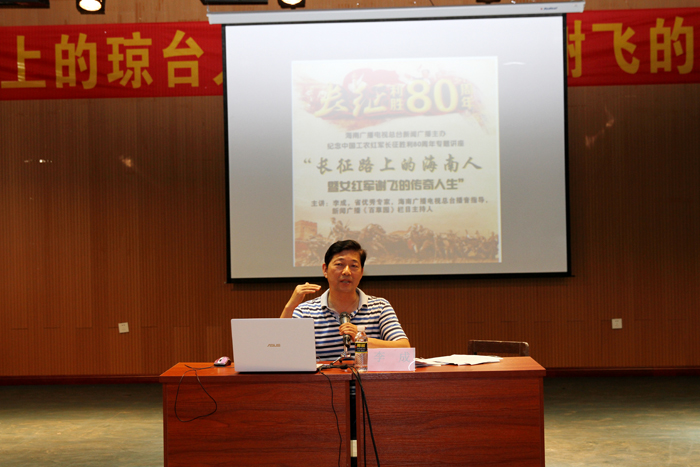 今年是长征胜利八十周年,11月15日下午,由宣传统战部、团委共同主办的“长征路上的琼台人·女红军谢飞的传奇人生”专题讲座在综B音乐厅举行,海南广播电视总台播音指导、新闻广播《百草园》栏目主持人李成到校为师生讲述了长征路上谢飞同志这位琼台走出的巾帼英雄一生传奇。