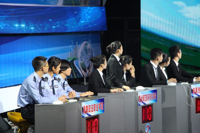 参赛队伍分别是海南大学、海南师范大学、海南热带海洋学院、琼台师范高等专科学校、三亚学院、海南政法职业学院、海南经贸职业技术学院、海口经济学院的八个代表队的同学,他们通过初赛、复赛的选拔,在众多所高校中脱颖而出参加决赛。大赛分为个人答题、抢答、辩论等四个环节进行,其中,海口“最美交警”蔡建家为第二环节中交通手势指挥进行出题。辩论环节把比赛推上了高潮,八个代表队的学生分别针对电动自行车驾驶员是否需要考核交通规则、交通秩序的维系主要靠法律还是靠道德约束等论题进行了交锋、辩论。最终,海南热带海洋学院代表队以240分最终获得了冠军,琼台学子密切配合、随机应变,最终以170获得三等奖。