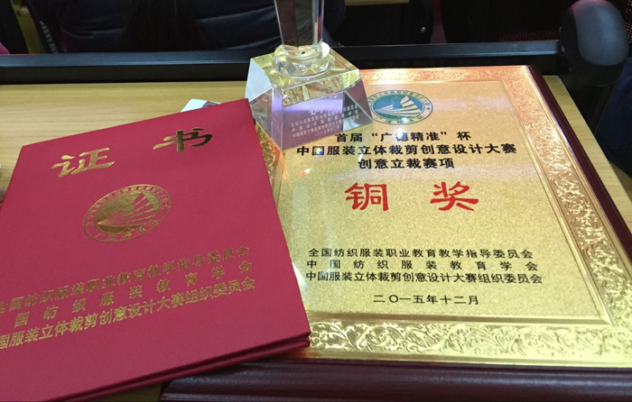 12月26日—29日,全国首届“广德精准”杯中国服装立体裁剪创意设计大赛在东莞虎门举行,我校美术系曹春楠老师和吴晨珠老师参加比赛,在来自全国的近200名参赛选手的激烈角逐中,曹春楠老师获得铜奖,吴晨珠老师获得优秀奖。