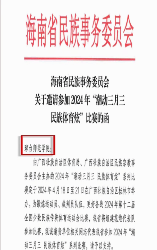 海南省民族宗教事务委员会,为筹备和备战2024年第十二届全国少数民族传统体育运动会中的花炮比赛,委托我校组建花炮队代表海南民宗委参加比赛,体育学院主动承接比赛任务,及时组建花炮队。在教练符智勇老师的带领下,经过一个多月的刻苦训练。代表队顺利完成组队、训练及参加比赛。在比赛中,队员们在教练的细致指挥下,通过顽强拼搏,展现出了精湛的技艺和良好的体育道德精神,赢得了评委和观众的一致好评。并取得此次赛事男子花炮三等奖(第五名)的优异成绩。