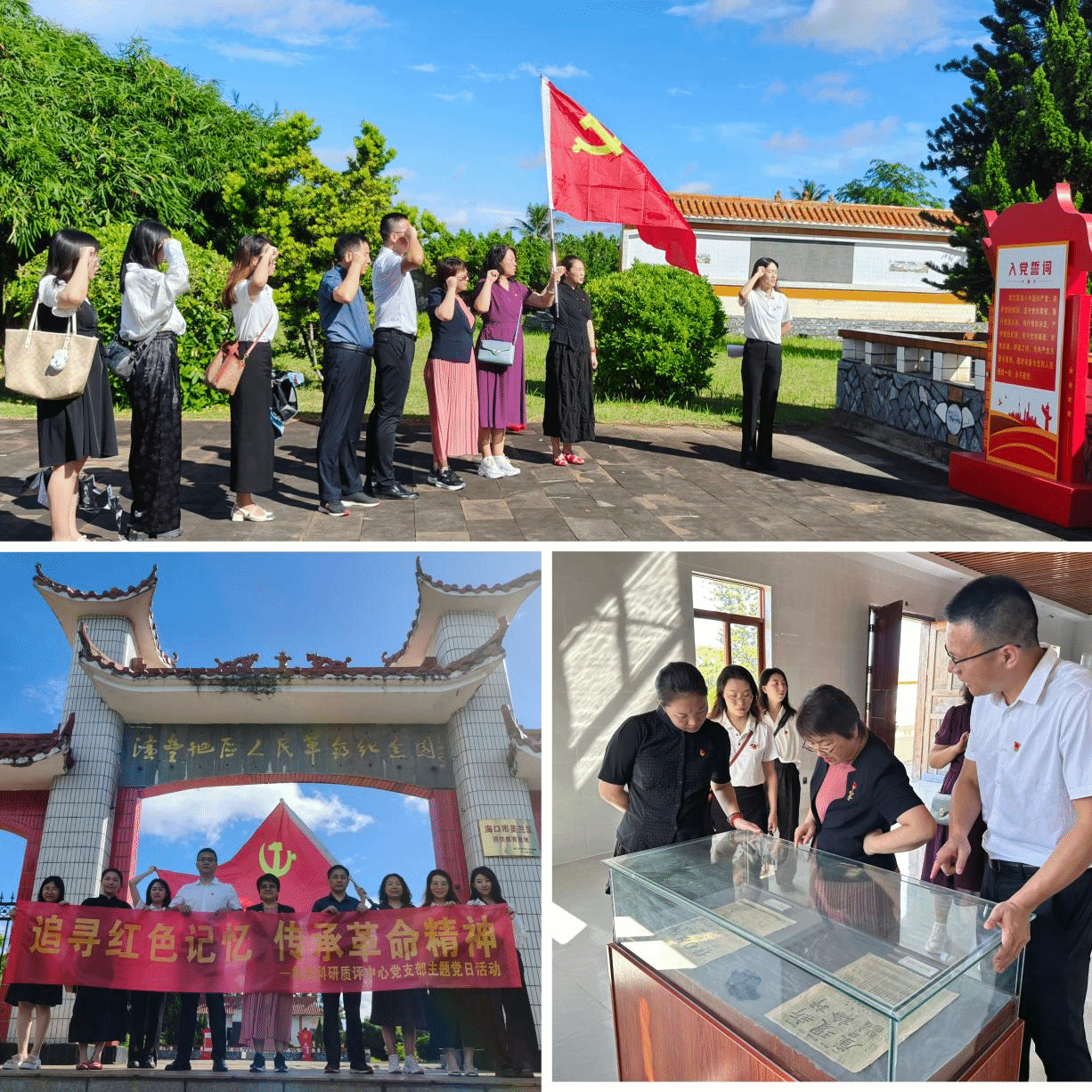 支部全体党员来到演丰地区人民革命纪念园,缅怀革命先烈,重温入党誓词,通过瞻仰一张张图片和一件件遗物追寻542名演丰英烈的抗战足迹。刘湘洪校长带领党员同志们重温了校友徐成章(建国陆海军大元帅府铁甲车队长、琼崖红军东路总指挥)、徐天炳(马来亚共产党中央第一任书记)等革命先烈的英雄事迹,学习了烈士们为了实现国家富强、民族振兴、人民幸福,抛头颅、洒热血,献出宝贵生命的英雄故事。