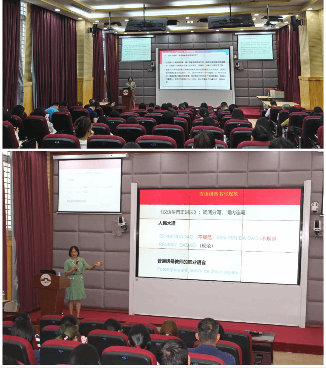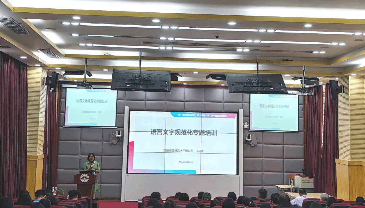 为大力推广国家通用语言文字,切实提高师生规范使用国家通用语言文字的意识与能力,筑牢强国语言基石,9月25日下午,学校语言文字工作委员会与国家语言文字推广基地(琼台师范学院)于实验楼D栋102联合举办了语言文字规范化专题培训。培训由国家级普通话水平测试员、海南师范大学杨若虹副教授主讲,海南省普通话与文字应用培训测试中心主任、文学院副院长蔡青主持。