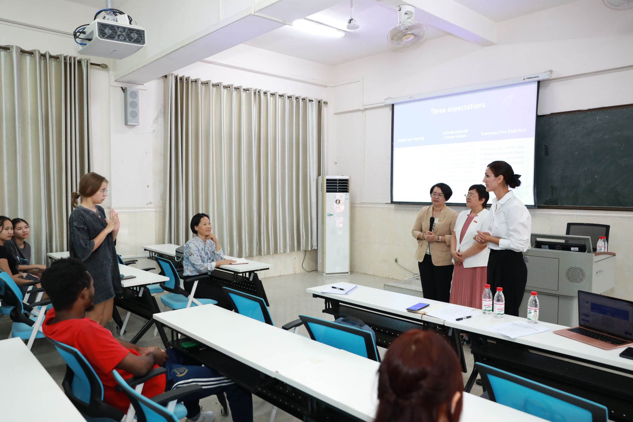 刘湘洪校长首先向新同学的到来表示热烈的欢迎和衷心的祝贺。并以“当好中外文化友好使者 共筑海南自贸港新篇章”为题介绍了海南自贸港的建设情况和发展规划。她详细讲解了自贸港“三度一色”的优势、“五向图强”的核心竞争力以及未来的发展前景,让留学生们对海南这片热土有了更深入的了解。