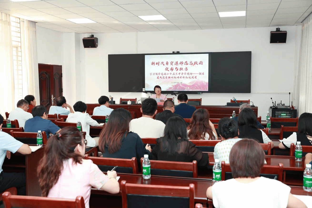 近日,校党委副书记、校长刘湘洪在行政楼四楼会议室为机关党支部作了题为《新时代自贸港师范高校的使命担当》的专题辅导讲座。报告由机关科研质评中心党支部书记黄细渭主持。
