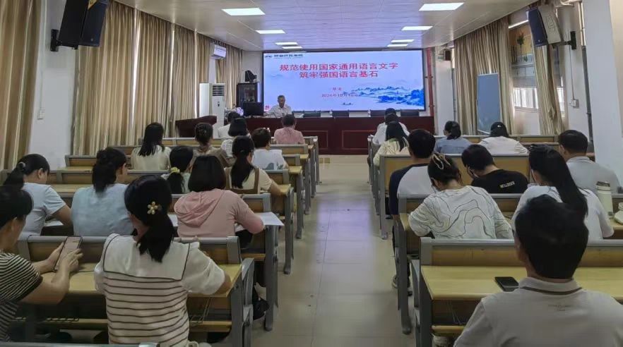 蔡青老师为定安县龙河中心小学和定安县龙河中学的行政人员、教师做了语言文字规范专题讲座。蔡老师通过语言文字工作中的实例,深入阐述了国家语言文字工作的重要性、国家对城市语言文字的总体目标和基本要求、方言和繁体字的使用等内容,提高了教师们规范使用语言文字的意识。