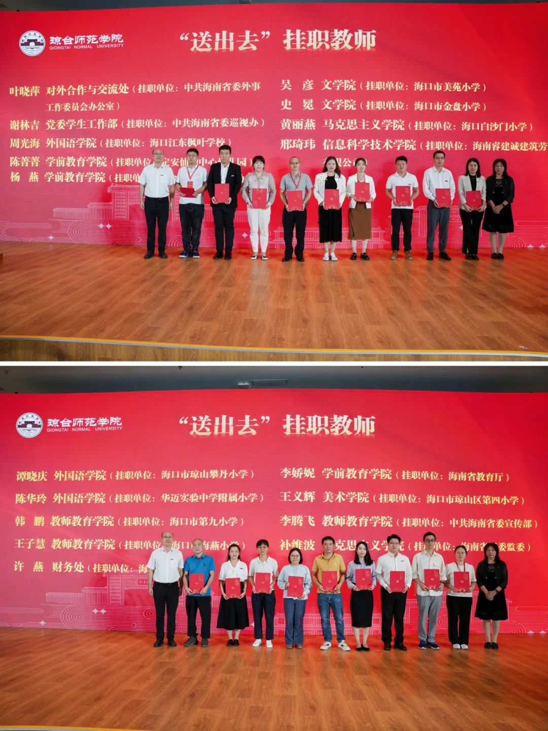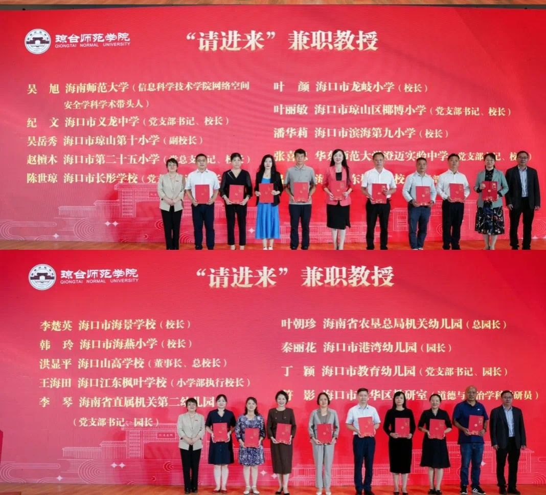 会上,学校向“请进来”的58位来自海南省中小学书记、校长、幼儿园园长、一线教学名师、行业企业高层次人才、专业技术骨干、高层管理干部颁发琼台师范学院兼职教授聘书。向“送出去”挂职的28位教师颁发证书。