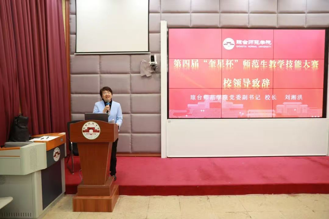 开幕式上,刘湘洪校长发表致辞,向远道而来的各位评委们表示热烈欢迎和衷心感谢!她指出,“奎星杯”之名,源自于清代的奎星楼,它是琼台书院的主体建筑,象征着知识的传承与智慧的启迪。以“奎星”命名,寓意着希望每一位学生都能“讲学穷理”,在读书与立品中成长为端人正士,成为有用之才,为未来的教育事业打下坚实的基础。她强调,“奎星杯”不仅是一场技能的较量,更是一次教育理念的交流与碰撞,它为师范生提供了一个展示自我、锻炼能力的舞台,是学校教育教学改革的重要实践。