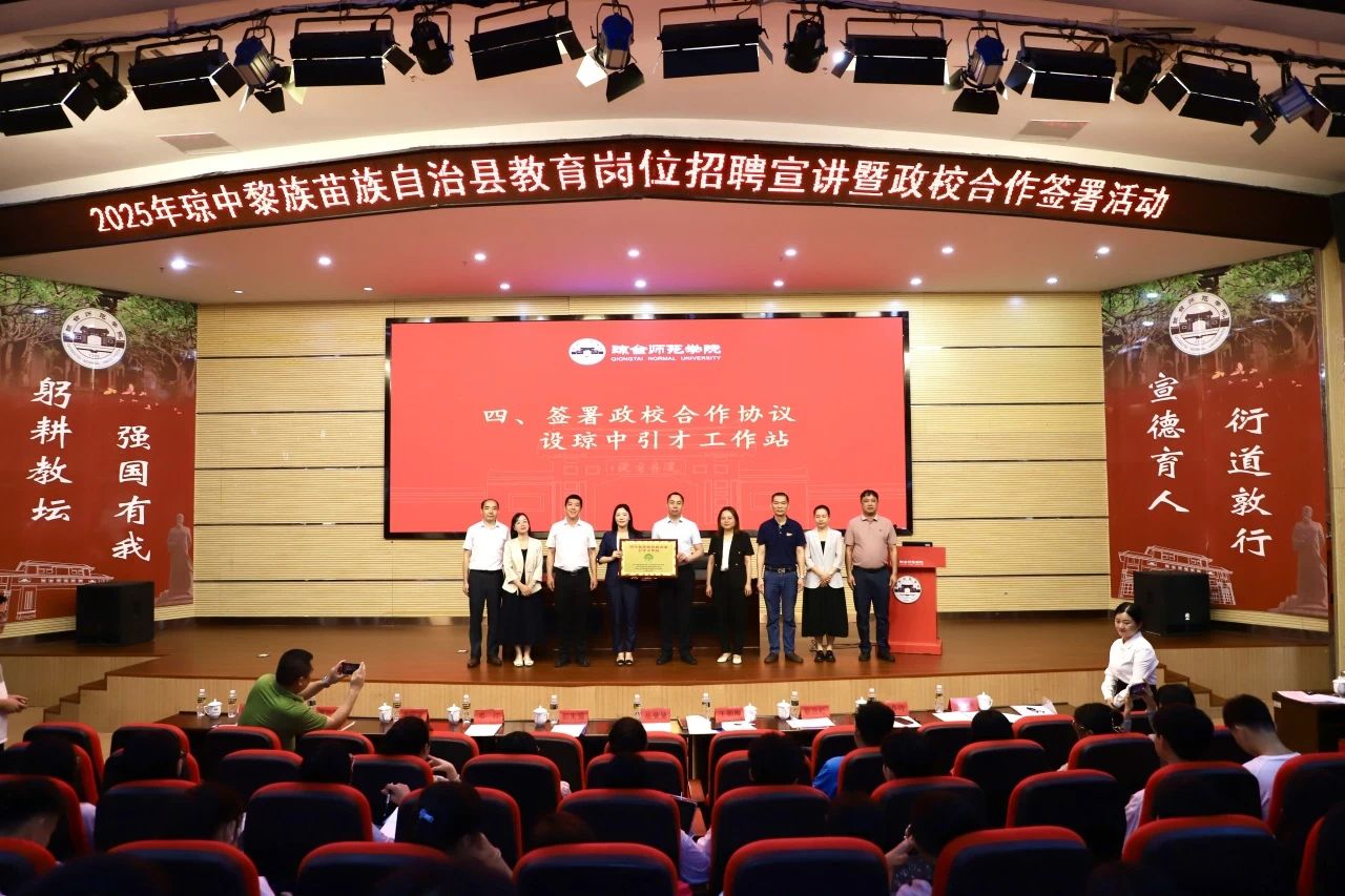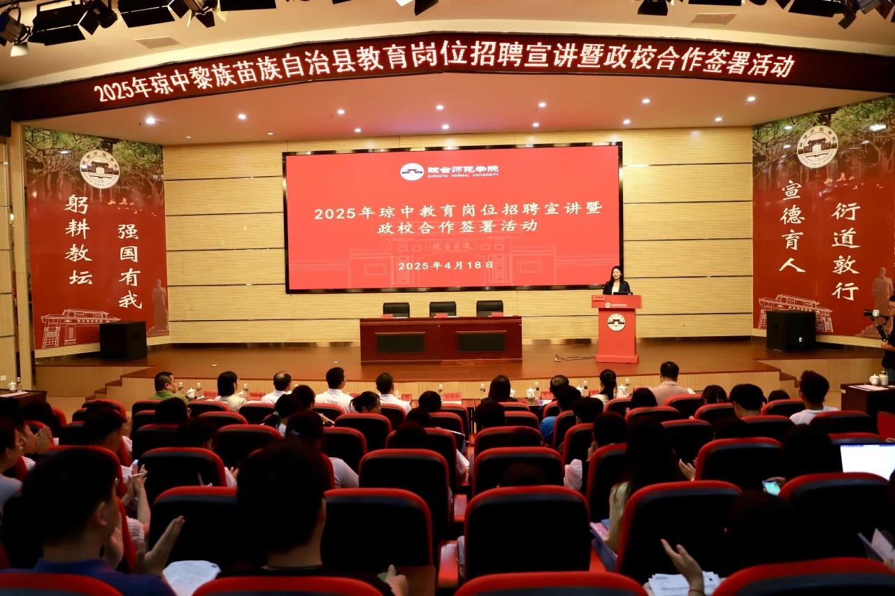 4月18日上午,我校与琼中黎族苗族自治县人社局、教育局、人才发展局联合举办的“2025年琼中教育岗位招聘宣讲暨政校合作签署活动”在桂林洋校区图书馆报告厅举行。