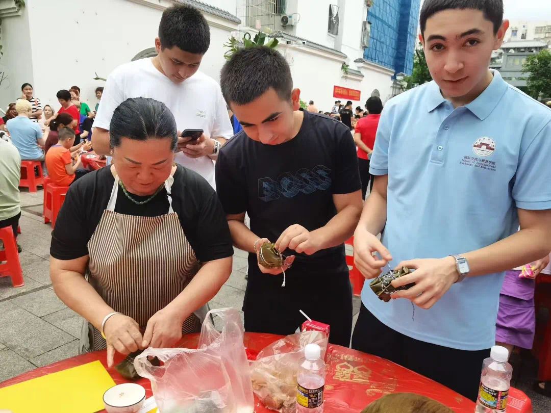 志愿者们和留学生们还分别参加了包粽子的活动,折粽叶、装糯米、放馅料、裹扎绳……大家都铆足了劲埋头苦“包”,想尝试包出外观紧凑精美、米馅配比恰当的好粽子,在动手实践中重温传统习俗。