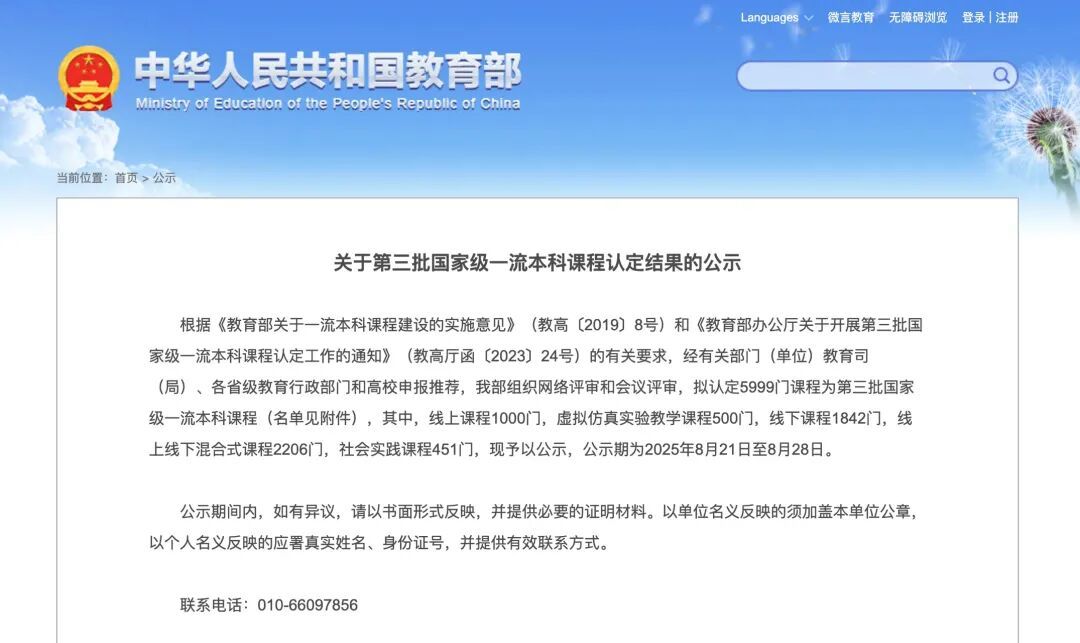 近日,教育部网站发布第三批国家级一流本科课程认定结果公示,拟认定5999门课程为第三批国家级一流本科课程。我校三门课程获评线下一流课程。