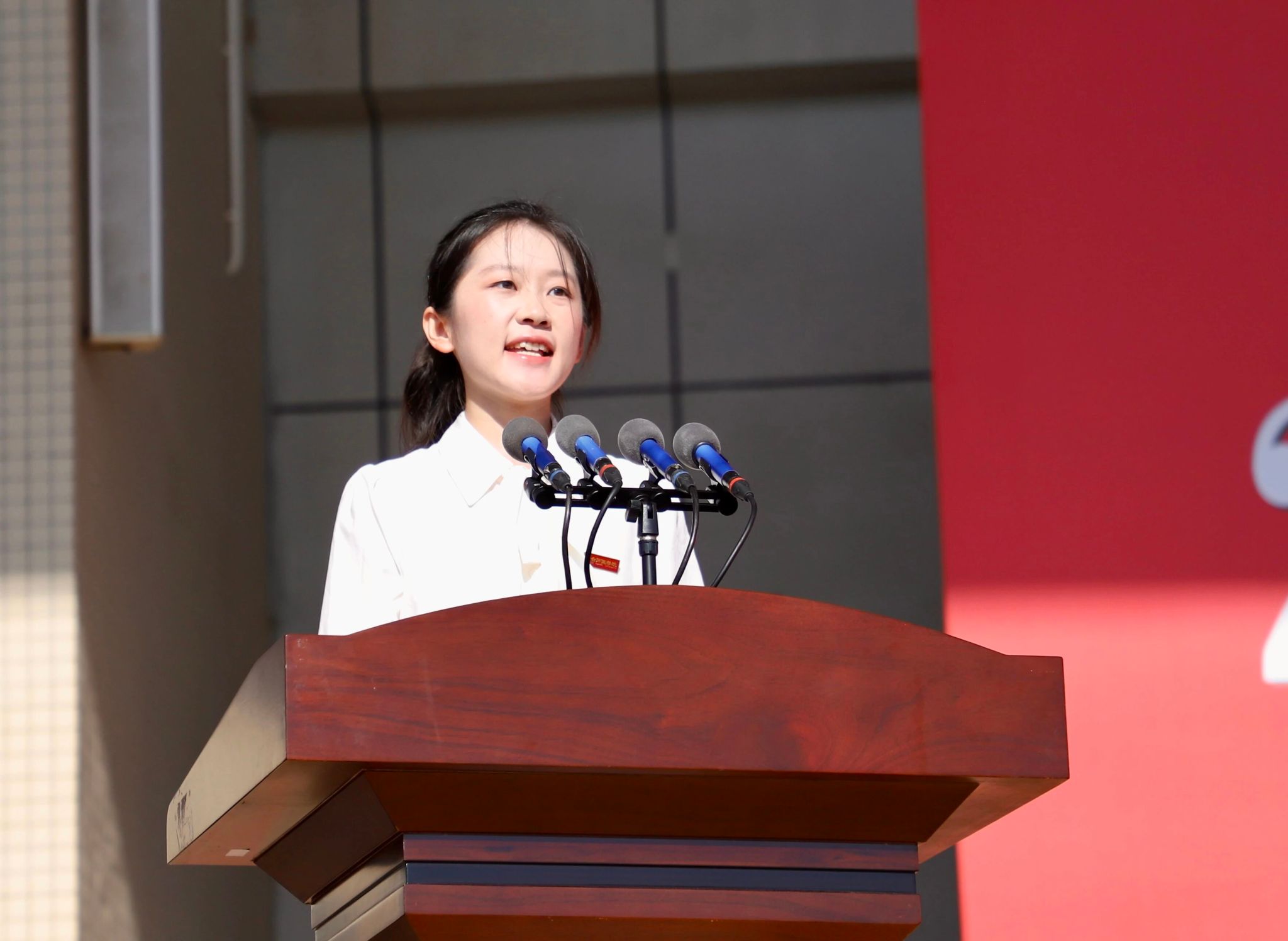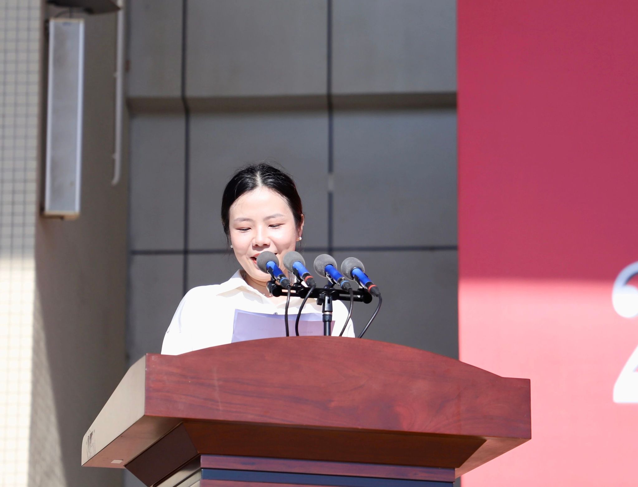 教师代表音乐学院唐懿姝发言:希望新同学们做“求真笃学”的探索者,做“敢闯敢试”的创新者,做“协同共进”的同行者,以青春为笔,书写无愧于时代、无愧于自我的华彩篇章!