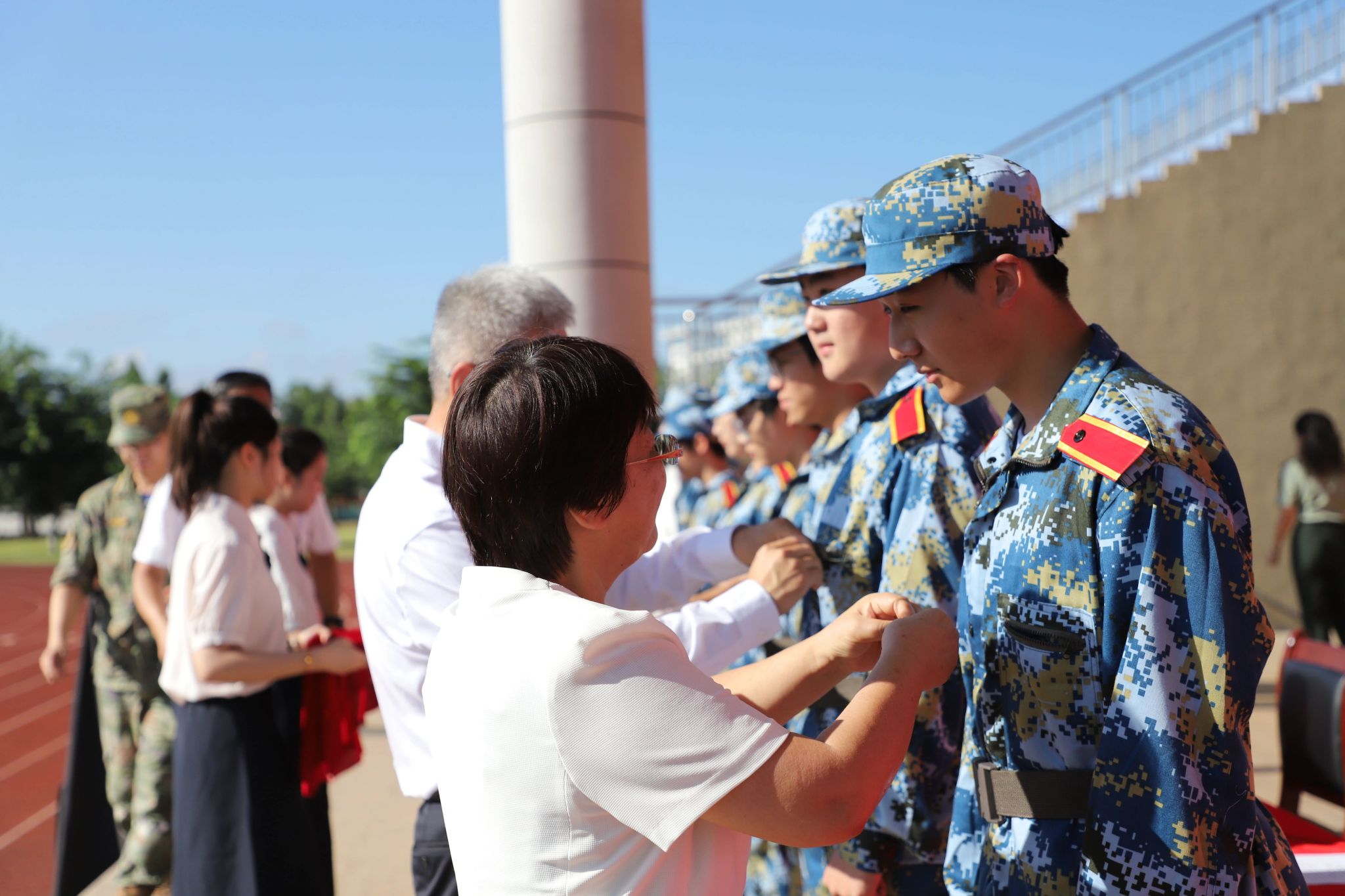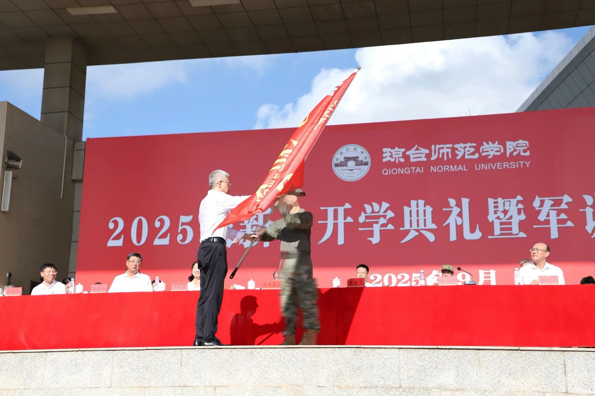校长李宇飞向军训团授旗并发布开训令。随着指令的下达,2025级新生军训正式启动,全体新生以饱满的精神状态投入训练。