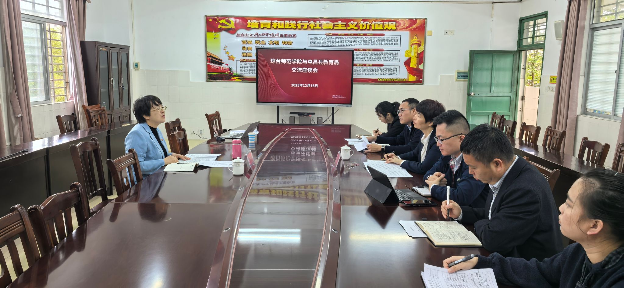 刘湘洪在座谈中表示,学校将持续发挥自身优势,积极推动与屯昌县建立长期、稳定、深入的合作关系,落实校县合作协议及薄弱学校帮扶计划,助力屯昌县基础教育高质量发展。