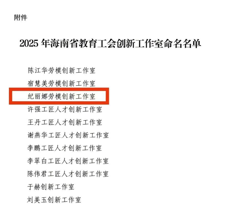 近日,2025 年海南省教育工会创新工作室评选结果正式公布,全省共 11 个工作室获此命名。我校纪丽娜领衔的劳模创新工作室成功入选,被正式授予“纪丽娜劳模创新工作室”称号。