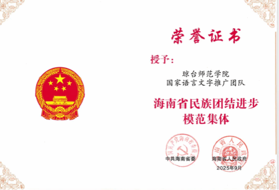 会议宣读省委、省政府关于表彰海南省民族团结进步模范集体和模范个人的决定,决定授予49个集体模范集体称号、50名个人模范个人称号。琼台师范学院国家语言文字推广团队荣获 “海南省民族团结进步模范集体” 称号。