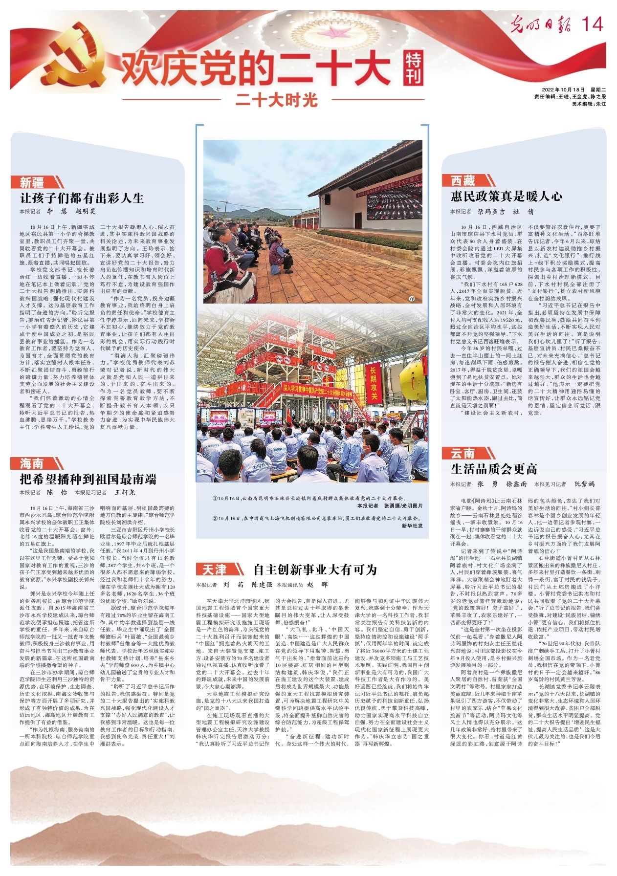“聆听了习近平总书记所作的报告,我倍感振奋。特别是党的二十大报告提出的‘实施科教兴国战略,强化现代化建设人才支撑’‘办好人民满意的教育’,让我感到非常温暖。这也是每一位教育工作者的目标和行动指南,我感到使命光荣,责任重大!”刘湘洪表示。