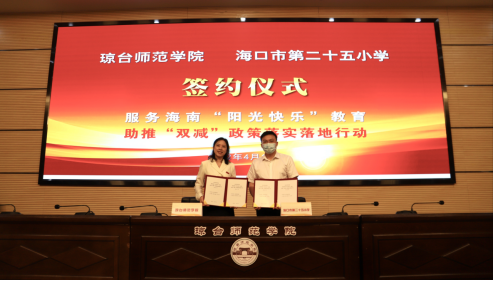 会上,琼台师范学院分别和海口市第二十五小学、海口市海景学校、海口市琼山区云龙镇中心小学、海口市琼山区椰博小学等四所小学签订了“服务海南‘阳光快乐’教育 助推‘双减’政策落实落地”协议,下一步将共同如何帮助义务教育阶段学校充分利用课后时间,为学生提供丰富多彩的课后服务内容、充足的学习发展空间,更好地满足学生个性化发展需求和全面健康成长等问题。该项目的实施,也是打通高校与小学教学科研合作平台,深入探索建立师范大学生课后服务体系的重要途径。
