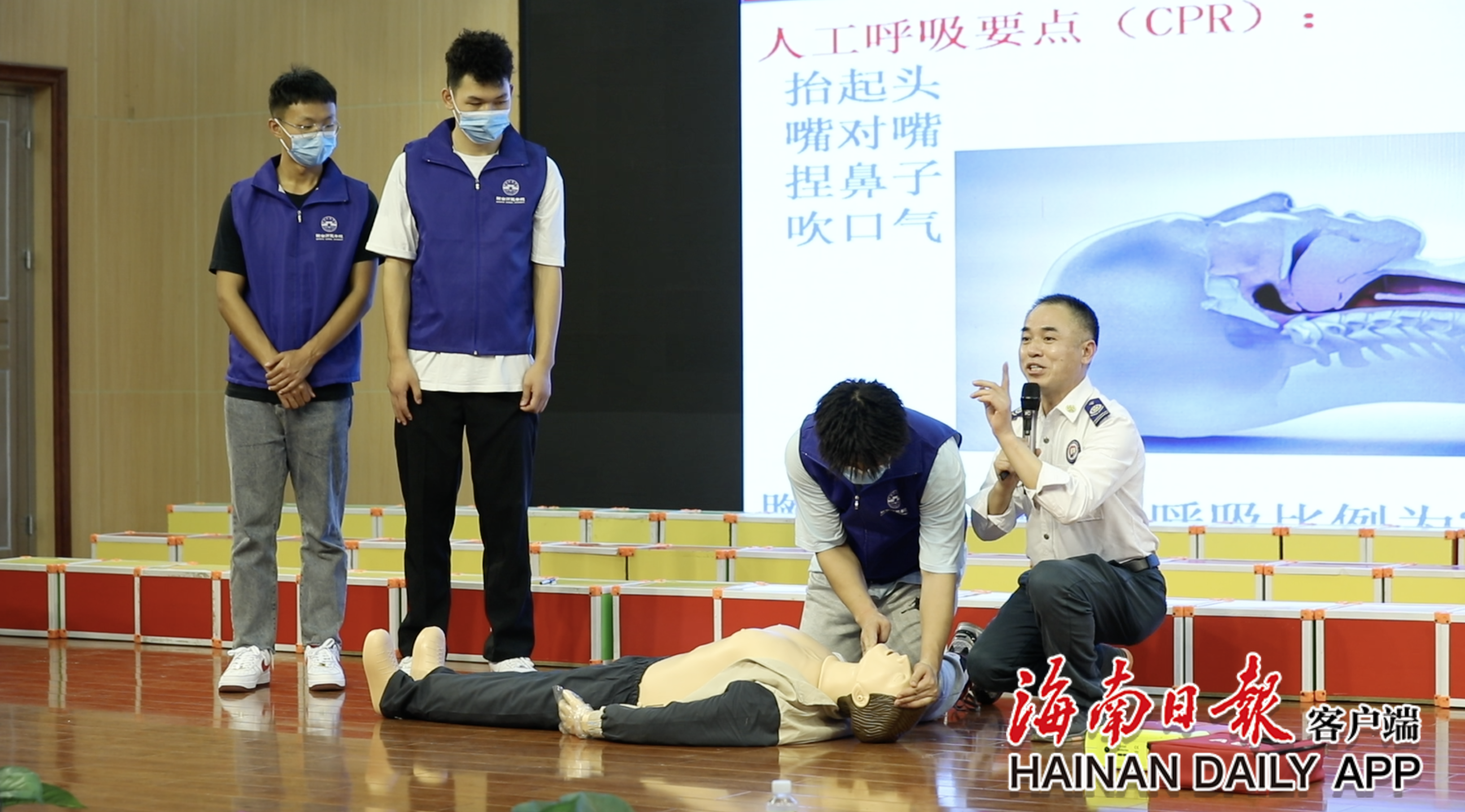 海南省急救医学培训中心现场急救行动指南培训导师刘仕富正向该校学生宣讲心肺复苏术急救知识 陈若龙摄