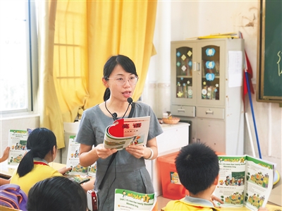 “Hello, boys and girls!(同学们,你们好!)”9月1日,还没走进屯昌县南吕镇中心校鹿寨小学五年级教室,海南日报记者耳边就传来Miss Zhou(周老师)用英语与学生们打招呼的声音。这是她新学年给学生们上的第一节英语课。