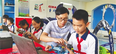 吴显周指导学生组装机器人。海南日报记者 林书喜 摄