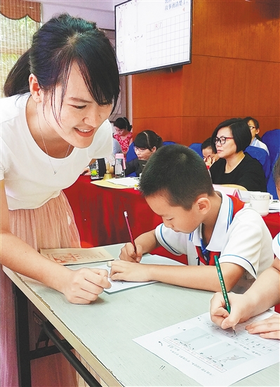 9月2日,记者在福山中心学校二年级4班教室里看到许丹丹正辅导学生学习,细密的汗珠挂在她的脸上。