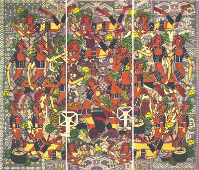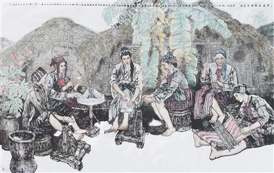 《黎族纺染织绣图》(版画) 陈为云 林超 作