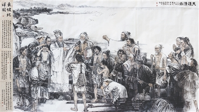 东坡北归,黎汉人民争相送别。美术家乔德龙《桄榔庵中唱苏公》水墨画以饱满笔墨表现出当时惜惜依别的场景。为了创作,他做了大量案头工作,深入感受历史的厚重。高官、大儒、沧桑……乔德龙的笔下,一个难舍琼州却又切切盼归的老者东坡形象直触人心。