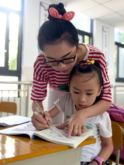 ↑5月4日,教师林美翠正手把手辅导学生写字。