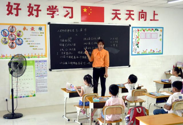 ↑5月4日,教师唐华玲正在给一年级的学生上课。